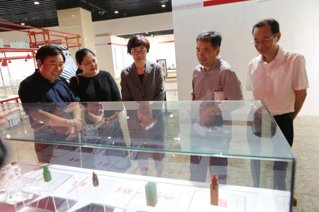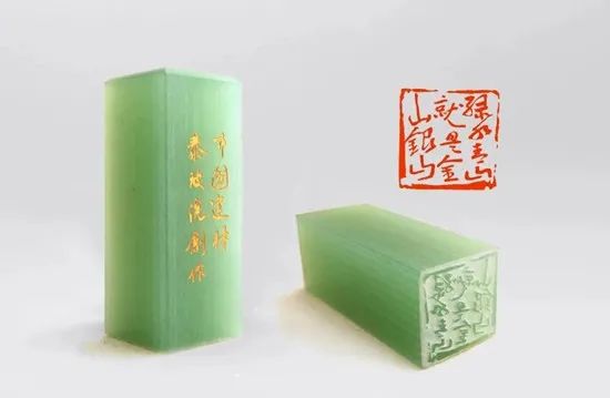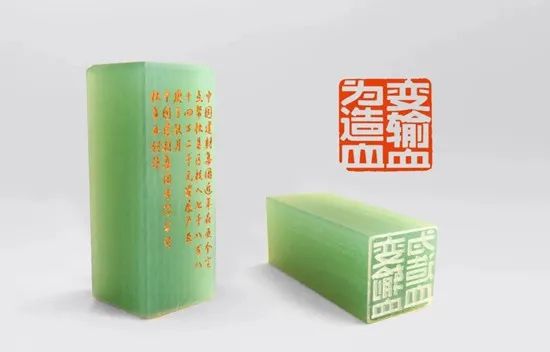 “這個(gè)印章的材質(zhì)好漂亮,像青玉一樣。是用真的玉篆刻的嗎?”在燈火通明的玻璃展示架前,有游客詢問講解人員。