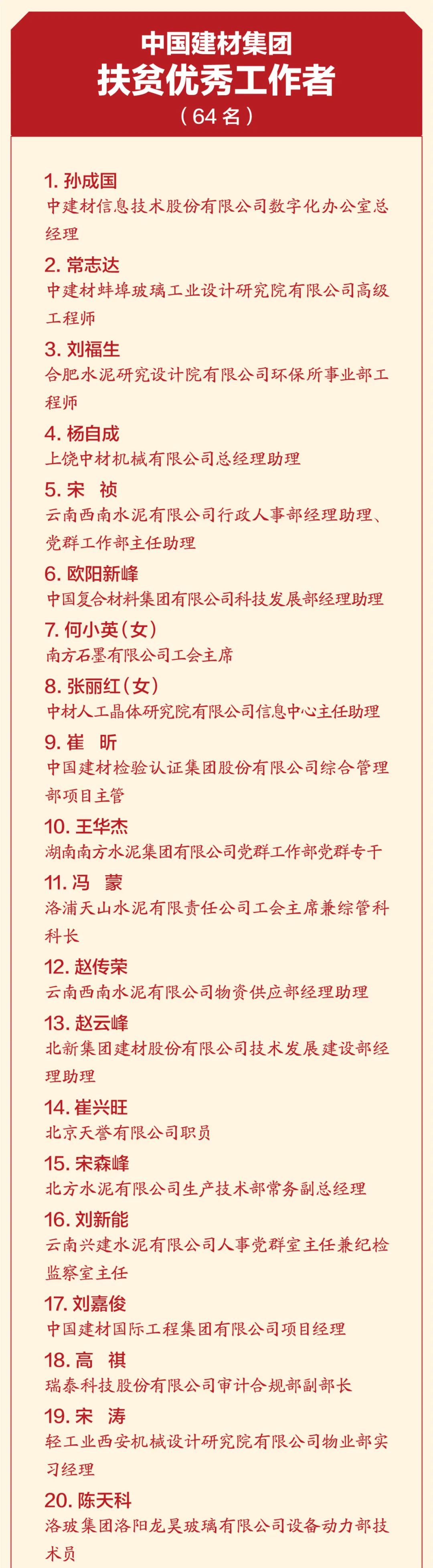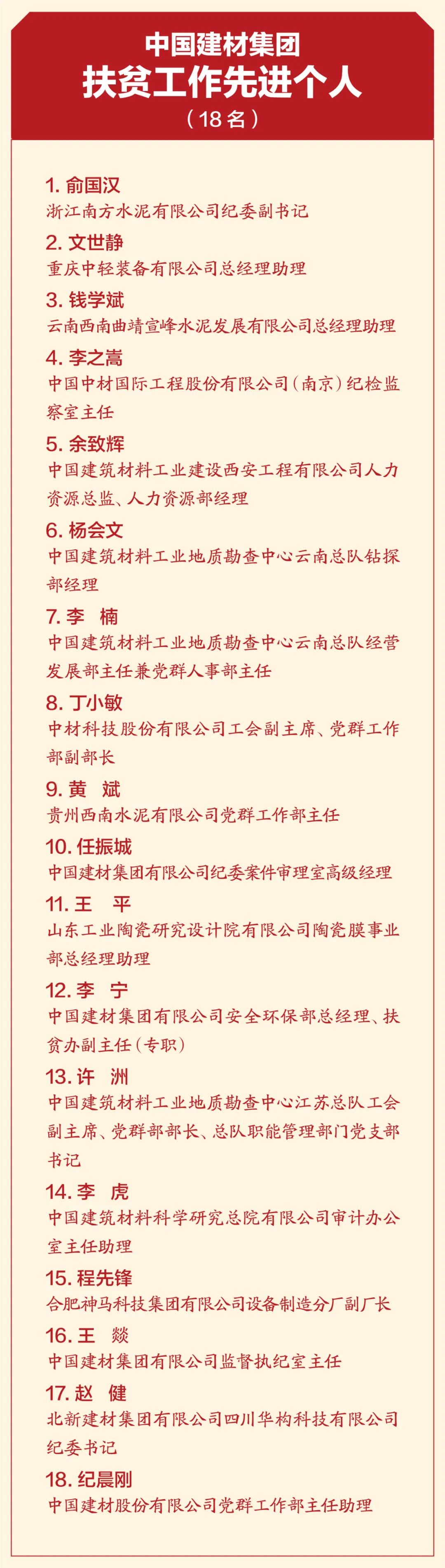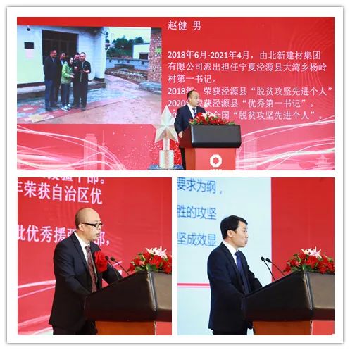 4月19日,中國(guó)建材集團(tuán)扶貧工作暨援疆援藏工作表彰大會(huì)在京召開(kāi),會(huì)議深入學(xué)習(xí)貫徹習(xí)近平總書(shū)記重要講話(huà)精神,特別是習(xí)近平總書(shū)記關(guān)于扶貧工作的系列重要論述,全面總結(jié)集團(tuán)扶貧工作及援疆援藏工作任務(wù)完成情況,表彰集團(tuán)在扶貧工作和援疆援藏工作中涌現(xiàn)出來(lái)的先進(jìn)個(gè)人和集體,并就接續(xù)鄉(xiāng)村振興做好下一階段工作做出安排部署。 中國(guó)建材集團(tuán)扶貧工作紀(jì)實(shí)片 國(guó)資委科技創(chuàng)新和社會(huì)責(zé)任局副局長(zhǎng)張曉紅出席會(huì)議并致辭,國(guó)家鄉(xiāng)村振興局社會(huì)扶貧司定點(diǎn)扶貧處處長(zhǎng)周曉云,中國(guó)志愿服務(wù)基金會(huì)副理事長(zhǎng)兼秘書(shū)長(zhǎng)姚桂清出席會(huì)議。集團(tuán)黨委書(shū)記、董事長(zhǎng)周育先發(fā)表重要講話(huà),集團(tuán)黨委副書(shū)記、董事、總經(jīng)理曹江林宣讀表彰決定。集團(tuán)黨委常委、副董事長(zhǎng)李新華,黨委副書(shū)記孫力實(shí),黨委常委、總會(huì)計(jì)師詹艷景,黨委常委、紀(jì)委書(shū)記楊杰,黨委常委、副總經(jīng)理王于猛、魏如山出席會(huì)議。 國(guó)資委科技創(chuàng)新和社會(huì)責(zé)任局副局長(zhǎng)張曉紅 張曉紅在致辭中對(duì)中國(guó)建材隆重召開(kāi)扶貧工作暨援疆援藏工作表彰大會(huì)表示祝賀!對(duì)中國(guó)建材在脫貧攻堅(jiān)、援疆援藏工作中取得的成績(jī)表示肯定!她指出:中國(guó)建材舉全集團(tuán)之力,盡銳出戰(zhàn),傾心幫扶,在扶貧工作和援疆援藏工作中體現(xiàn)出了“政治站位高、幫扶措施實(shí)、干部作風(fēng)硬、脫貧成效好”四個(gè)鮮明特點(diǎn)。希望中國(guó)建材繼續(xù)做好鞏固拓展脫貧攻堅(jiān)成果同鄉(xiāng)村振興有效銜接,充分發(fā)揮中國(guó)建材的綜合優(yōu)勢(shì),在落實(shí)鄉(xiāng)村振興戰(zhàn)略、助力農(nóng)村高質(zhì)量發(fā)展中作出新貢獻(xiàn),取得新成績(jī)。 中國(guó)建材集團(tuán)黨委書(shū)記、董事長(zhǎng)周育先 周育先在講話(huà)中重申了扶貧工作與援疆援藏工作的重要意義。打贏脫貧攻堅(jiān)戰(zhàn),是全面建成小康社會(huì)最艱巨的任務(wù),是以習(xí)近平同志為核心的黨中央向國(guó)內(nèi)外做出的莊嚴(yán)承諾。援疆援藏工作是貫徹新時(shí)代黨的治疆治藏方略的工作要求。中國(guó)建材始終堅(jiān)持聽(tīng)黨話(huà)、跟黨走,不忘初心、牢記使命、勇?lián)?zé)任,堅(jiān)決貫徹落實(shí)黨中央、國(guó)務(wù)院和上級(jí)有關(guān)單位關(guān)于脫貧攻堅(jiān)、援疆援藏工作的各項(xiàng)部署要求。 周育先在講話(huà)中從四個(gè)方面回顧了中國(guó)建材的扶貧工作和援疆援藏工作。一是堅(jiān)持黨的領(lǐng)導(dǎo),提高政治站位,強(qiáng)化組織保證。二是突出精準(zhǔn)施策,注重因地制宜,提高脫貧實(shí)效。三是創(chuàng)新幫扶模式,善用平臺(tái)資源,凝聚各方力量。四是嚴(yán)格干部選派,加強(qiáng)作風(fēng)建設(shè),踐行初心使命。他指出:中國(guó)建材能取得這樣的成績(jī),根本在于黨的堅(jiān)強(qiáng)領(lǐng)導(dǎo)、在于全方位精準(zhǔn)施策、在于發(fā)揮好自身優(yōu)勢(shì)、在于凝聚起各方力量。在投身脫貧攻堅(jiān)過(guò)程中:我們堅(jiān)決落實(shí)以習(xí)近平同志為核心的黨中央決策部署,深入學(xué)習(xí)貫徹習(xí)近平新時(shí)代中國(guó)特色社會(huì)主義思想特別是習(xí)近平總書(shū)記關(guān)于扶貧工作的系列重要論述;我們認(rèn)真落實(shí)以人民為中心的發(fā)展思想,堅(jiān)決把精準(zhǔn)扶貧方略落到實(shí)處,真扶貧、扶真貧;我們統(tǒng)籌推進(jìn)企業(yè)發(fā)展與幫扶工作,精準(zhǔn)實(shí)施六大幫扶措施;我們充分調(diào)動(dòng)干部員工積極性和主動(dòng)性,舉全集團(tuán)之力,盡銳出戰(zhàn);我們與幫扶地區(qū)干部群眾同想同干,共謀發(fā)展。在扶貧工作和援疆援藏工作這場(chǎng)大戰(zhàn)大考中戰(zhàn)出了精氣神、考出了好成績(jī)。 脫貧摘帽不是終點(diǎn),而是新生活、新奮斗的起點(diǎn)。2021年是十四五的開(kāi)局之年,是全面實(shí)施鄉(xiāng)村振興戰(zhàn)略的起步階段。周育先要求:要以落實(shí)中央各項(xiàng)決策部署為根本,落實(shí)中央關(guān)于鄉(xiāng)村振興、援疆援藏的工作要求;落實(shí)集團(tuán)幫扶政策,圍繞六大幫扶措施進(jìn)行統(tǒng)籌安排;關(guān)心關(guān)愛(ài)幫扶干部,支持他們的工作,使幫扶干部心無(wú)旁騖的投入鄉(xiāng)村振興工作。要以黨史學(xué)習(xí)教育為契機(jī),學(xué)史明理、學(xué)史增信、學(xué)史崇德、學(xué)史力行,不忘共產(chǎn)黨人的初心使命,大力弘揚(yáng)脫貧攻堅(jiān)精神,團(tuán)結(jié)一心,英勇奮斗,與定點(diǎn)幫扶地區(qū)一起做好鞏固拓展脫貧攻堅(jiān)成果與鄉(xiāng)村振興有效銜接工作,乘勢(shì)而上,再接再厲,接續(xù)奮斗,以?xún)?yōu)異成績(jī)獻(xiàn)禮建黨百年! 中國(guó)建材集團(tuán)黨委副書(shū)記、董事、總經(jīng)理曹江林 曹江林宣讀表彰決定,黨的十八大以來(lái),集團(tuán)積極響應(yīng)習(xí)近平總書(shū)記號(hào)召,認(rèn)真貫徹落實(shí)