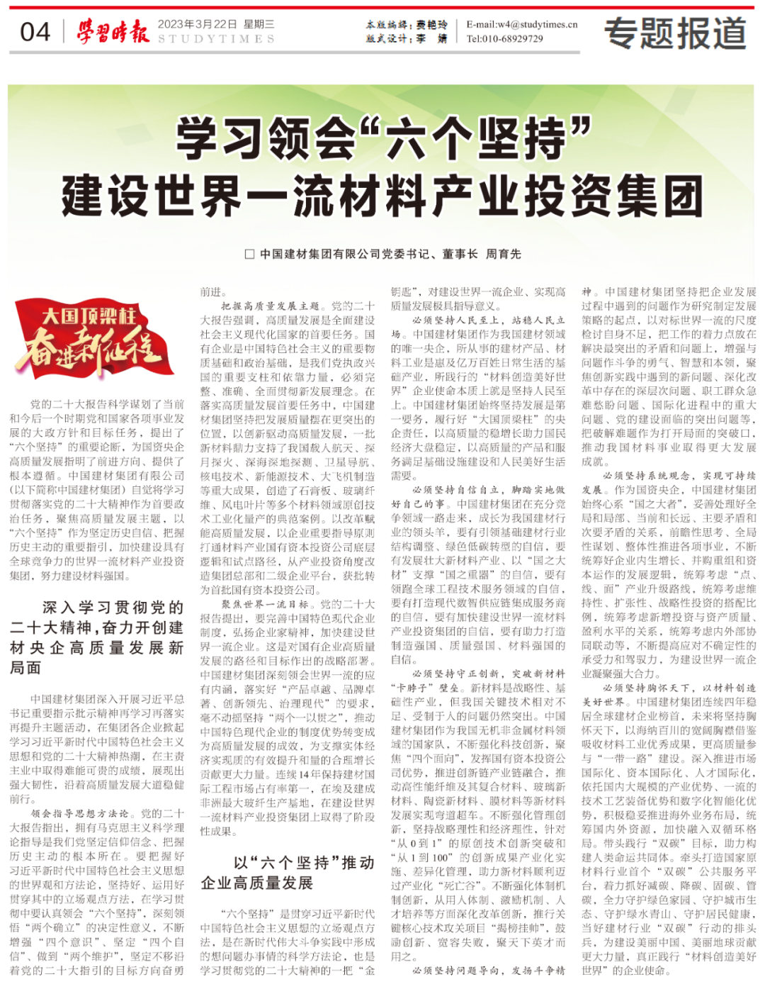 近日,《學(xué)習(xí)時(shí)報(bào)》“大國(guó)頂梁柱 奮進(jìn)新征程”專欄刊發(fā)了中國(guó)建材集團(tuán)黨委書記、董事長(zhǎng)周育先署名文章。文章聚焦高質(zhì)量發(fā)展主題,以“六個(gè)堅(jiān)持”科學(xué)方法論指引我們加快建設(shè)世界一流材料產(chǎn)業(yè)投資集團(tuán),努力建設(shè)材料強(qiáng)國(guó)。
